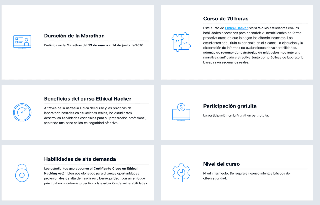 Ofrece a tus estudiantes una experiencia de aprendizaje inmersiva y sin precedentes participando en el Cisco CyberGames Americas Marathon. Este evento ha sido diseñado específicamente para dotarlos de habilidades prácticas y aplicadas, esenciales para identificar vulnerabilidades, comprender las técnicas de los atacantes y proteger de forma proactiva los activos digitales, convirtiéndose en una extensión clave del curso Ethical Hacker.